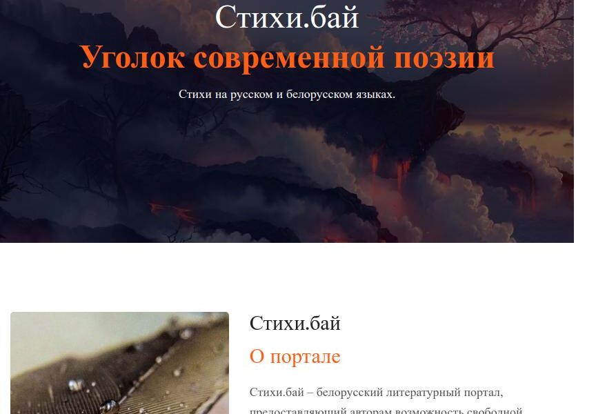 Stihi.by — это литературный портал современной поэзии, разработанный на платформе WordPress. Сайт представляет собой полноценную онлайн-площадку для поэтов и читателей, где авторы могут публиковать свои стихотворения через личный кабинет, редактировать и удалять произведения, управлять профилем и взаимодействовать с аудиторией. Для каждого стихотворения реализован счётчик прочтений, система комментариев и рецензий, возможность добавления изображений, тематическая категоризация и удобный поиск по сайту. У каждого автора есть собственная страница с опубликованными произведениями и информацией о себе. Дополнительно на портале реализован форум для общения авторов, система закладок для сохранения понравившихся стихов и адаптивный дизайн, обеспечивающий корректную работу сайта на компьютерах и мобильных устройствах.