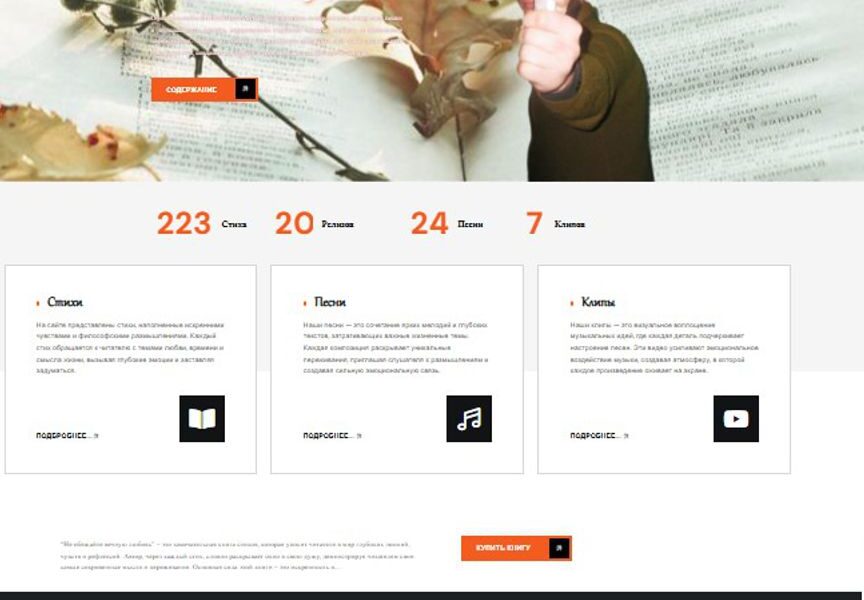 В результате был создан современный персональный сайт-визитка автора, объединяющий литературные и музыкальные публикации в едином онлайн-пространстве. Платформа позволяет удобно публиковать новые произведения, знакомить посетителей с творчеством автора и поддерживать актуальность контента. Благодаря оптимизированной структуре страниц, корректному отображению стихотворных текстов и адаптивному дизайну сайт быстро загружается, хорошо индексируется поисковыми системами и остаётся удобным для чтения и просмотра на любых устройствах.